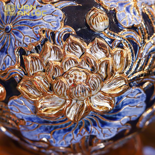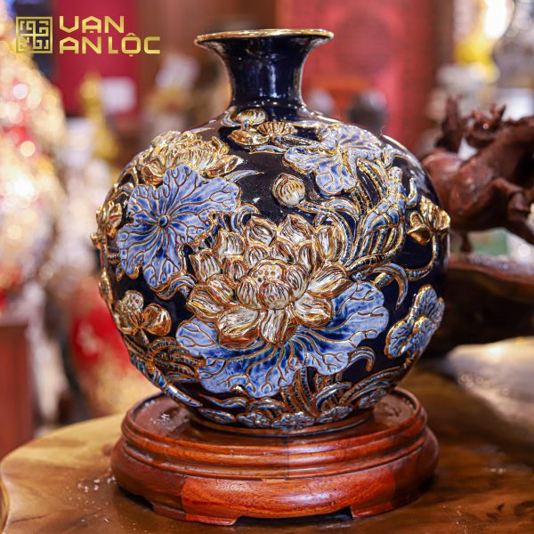 Bình Hút Lộc Liên Hoa Cát Tường Men Xanh Coban Vẽ Vàng Bát Tràng