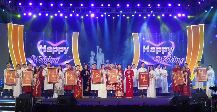 Các đồng chí lãnh đạo trao quà kỷ niệm cho các cặp đôi