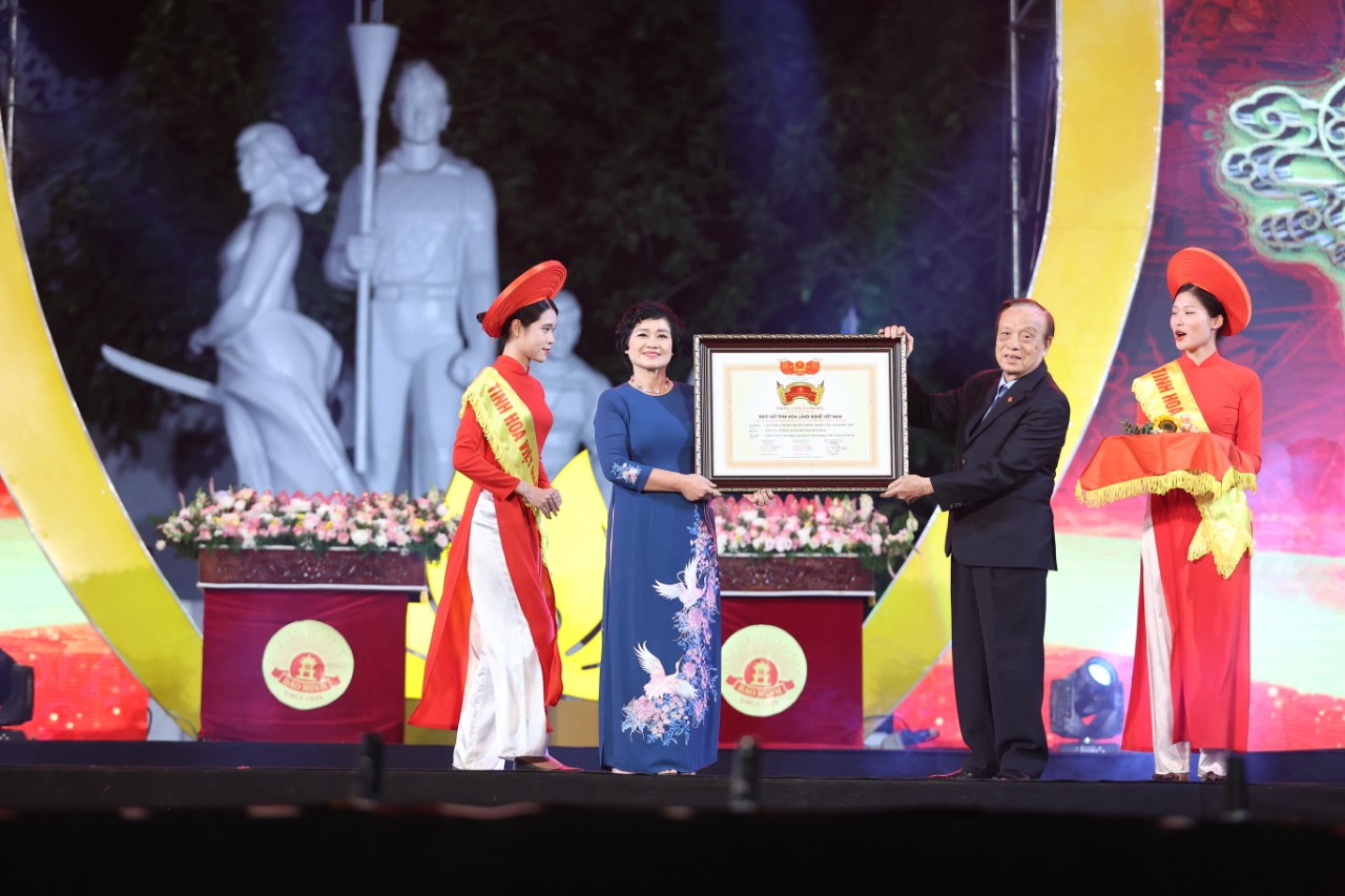 Hình ảnh nghệ nhân Ngô Thị Tính nhận bằng khăn từ tỉnh ủy Hà Nội