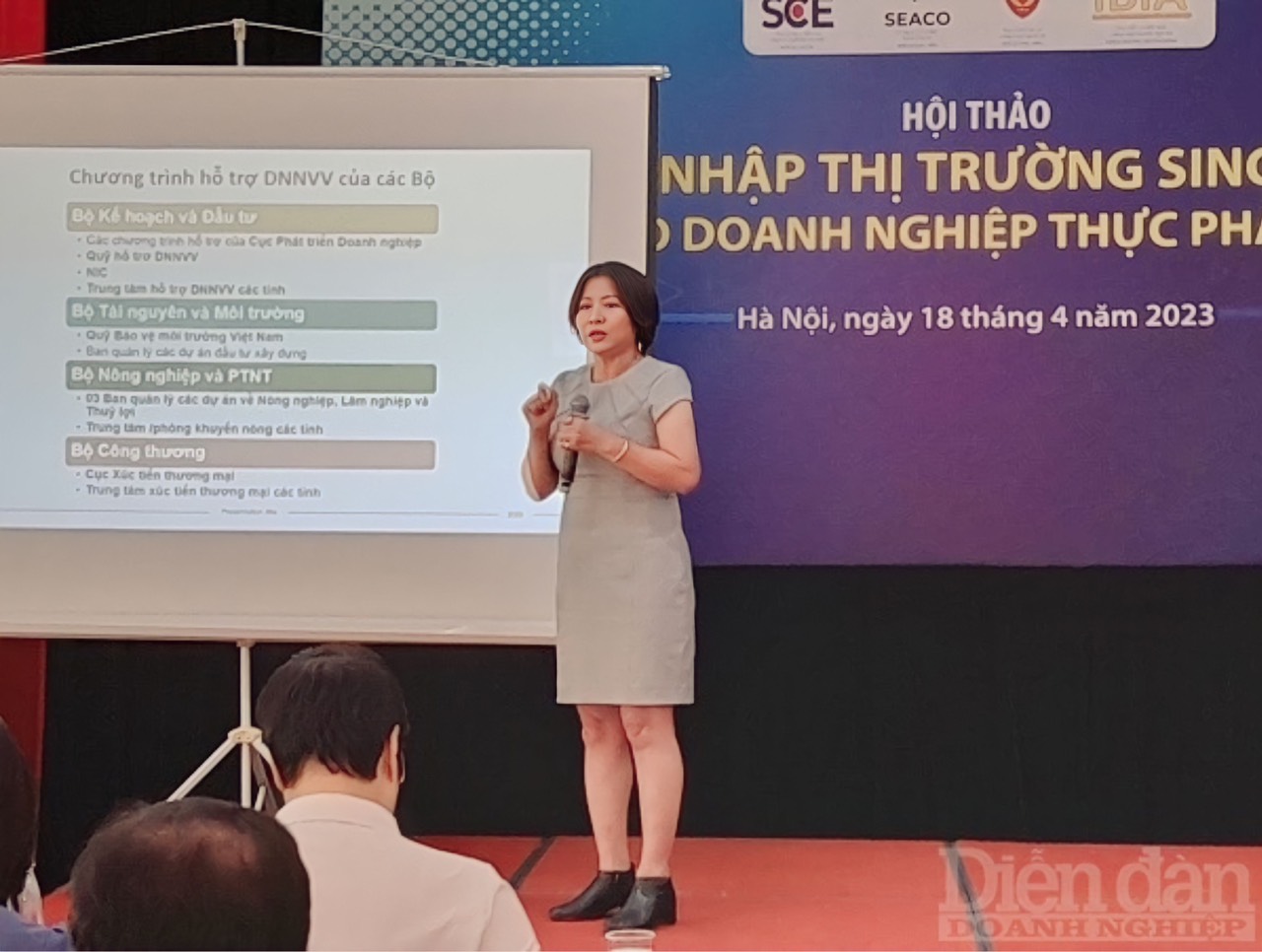 Tiến sỹ Dương Thị Kim Liên – Viện trưởng Viện Hỗ trợ đổi mới sáng tạo doanh nghiệp đã giới thiệu tóm tắt về các chính sách, chương trình và dự án nói chung của các bộ ngành, các nhà tài trợ trên cả nước hỗ trợ cho các doanh nghiệp, và phương pháp, cách thức, hay các kỹ năng tiếp cận các nguồn lực trong nước và quốc tế nhằm hỗ trợ phát triển cho các Doanh nghiệp.